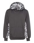 Badger Youth C/B Digital Hoody. 100% Polyester moisture management fabric. Sublimated digital side & sleeve panels. No drawcord. Front pouch pocket with two hook & loop closures at top of pockets with headset opening. Poly rib cuffs & waist. Embroidered Badger logo on left sleeve.
