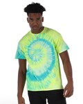Dyenomite Adult 5.3 Ounce Typhoon T-Shirt. A storm of style not to be missed. These tropical-inspired tie dyes will certainly cause a stir with their energetic colors. Preshrunk, 100% cotton, 5.3 ounce fabric. Double-needle stitched neckline and bottom hem.